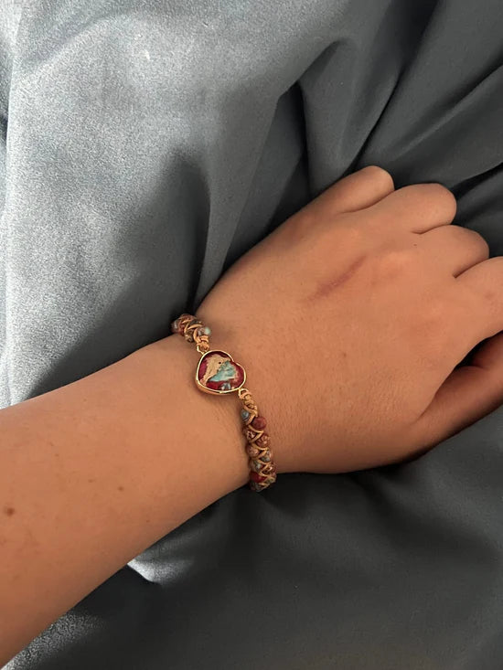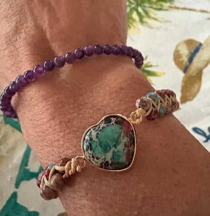 Each bracelet is handmade by our team of 5. The beauty is that each heart stone is unique, none of them are exactly the same.